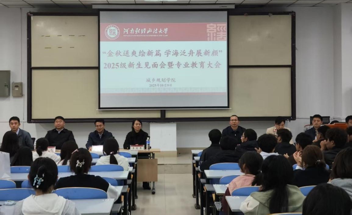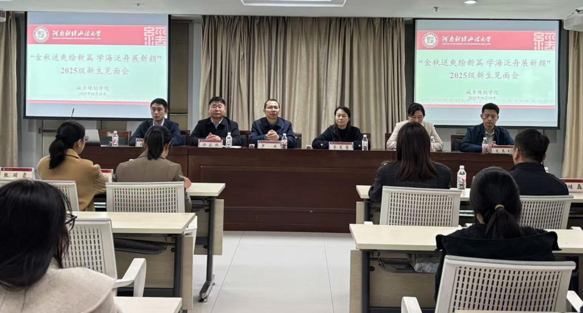 10月9日—10日,城乡规划学院在文北校区与郑东校区相继举行以“金秋送爽绘新篇,学海泛舟展新颜”为主题的2025级新生见面会,学院全体领导班子成员、各教研室主任、优秀教师代表、教学科研工作负责人、高年级学生代表以及全体2025级新生齐聚一堂,共同开启大学生活的美好篇章。我院优秀校友代表彭鑫、杨慧敏受邀参加大会,会议由学院党委副书记韩娜主持。